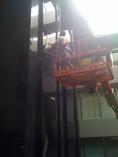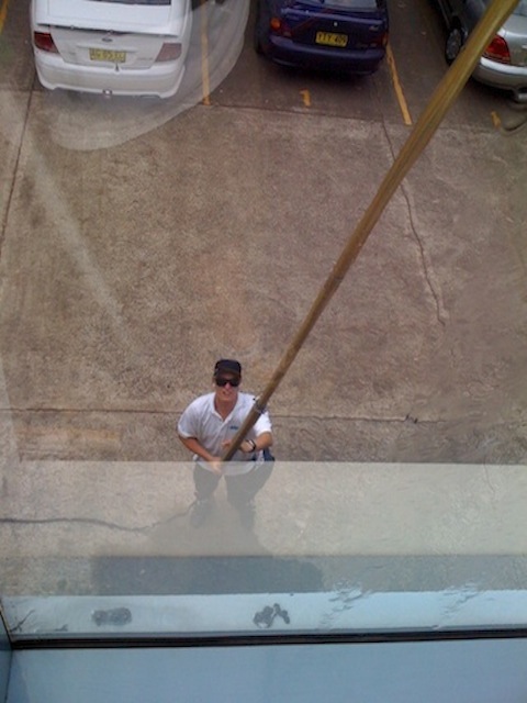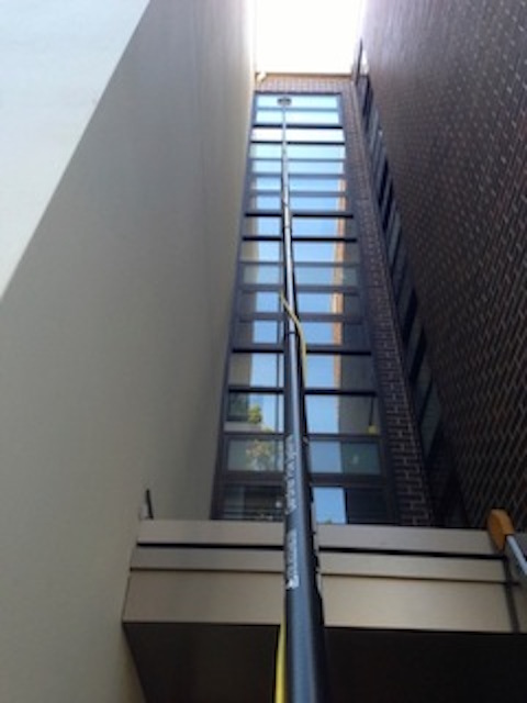 For much of this kind of commercial window cleaning, (and many homes too), the ideal way to clean the exterior glass is with a 'Water-Fed-Pole' and 'Pure Water'.